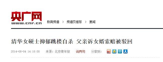 信源|央广网—清华女硕士抑郁跳楼自杀 父亲诉女婿索赔被驳回