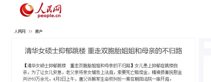 信源|人民网—清华女硕士抑郁跳楼 重走双胞胎姐姐和母亲的不归路
