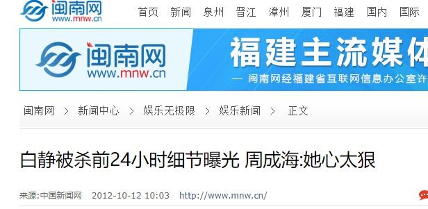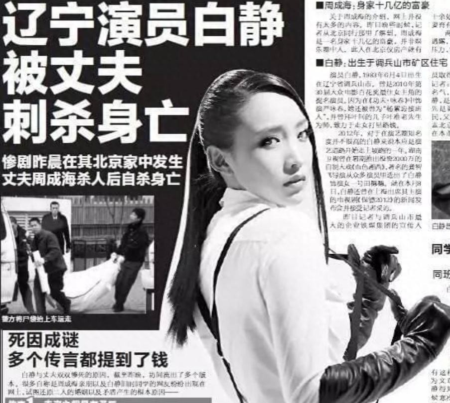 2012年2月份,突然网上曝出了演员白静被丈夫周成海刺杀身亡,并且周成海随后也自杀身亡的消息。