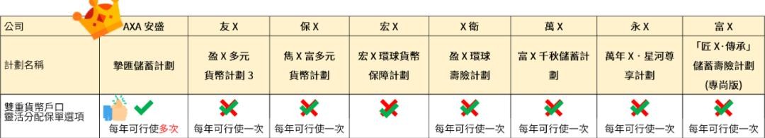 当时便提供了9种保单货币,至今仍保持领先地位;其预期回报高达7%,超过了友B「盈Y」一代的产品;此外,市场首创的保单货币“部分转换”功能,也为后来的港险产品引领了潮流,推动了保C、宏L等公司相继推出具备“开枝散叶”、“保单分拆”功能的多元货币储蓄险。2024年港险市场竞争激烈,安盛「挚汇」升级版亮相,引领新一波产品创新潮。这款产品不仅货币种类丰富,预期回报诱人,还具备市场首创的保单货币“部分转换”功能,为消费者提供了更多灵活选择。在众多竞争者中,安盛「挚汇」有望再次引领市场潮流。