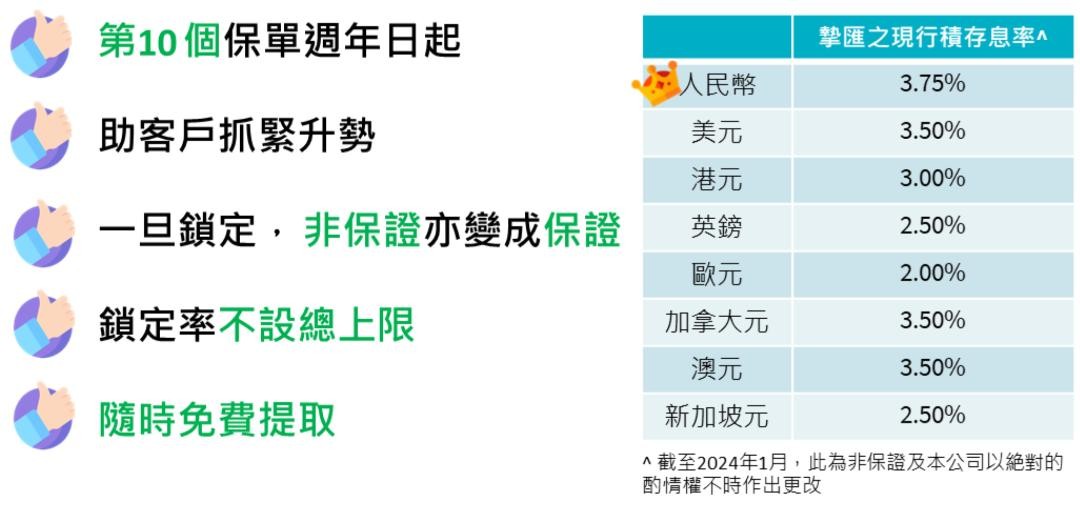 「挚汇」港险产品的红利锁定功能,旨在将非保证收益转为保证收益,从而降低市场波动对保单价值的影响。我们的红利锁定功能独具特色,市场首创双重货币账户,包括“主要货币账户”(与原保单货币相同)和“环球货币账户”(可选其他8种货币中的1种)。锁定的红利可以在两种货币中累积生息,并可随时提取。值得一提的是,升级后的“环球货币账户”货币可以随时更改,红利累积货币也可在8种货币中任选一种。这意味着,不仅保单货币可以自由转换,红利累积货币也有了更多的选择,使得整体灵活性得到提升。以下是当前各币种的积存利息信息: