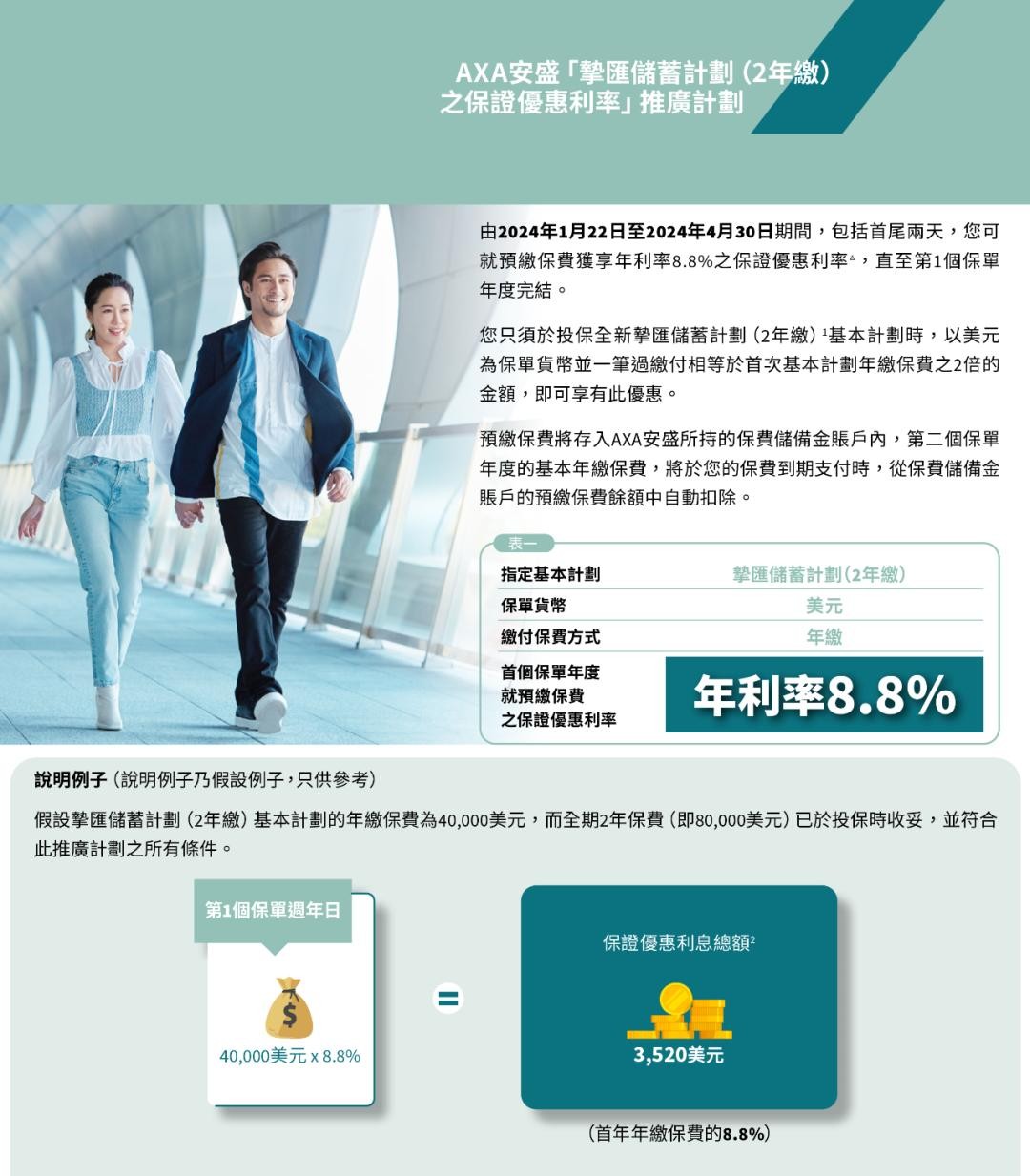 "2024年1月,安盛保险推出优惠活动!5年预缴保证利率猛增至4.5%,轻松领跑市场!此外,全新推出的2年期缴预缴优惠,预缴保证利率高达8.8%,再次刷新行业纪录!错过这次机会,您一定会后悔!赶紧行动起来吧!"