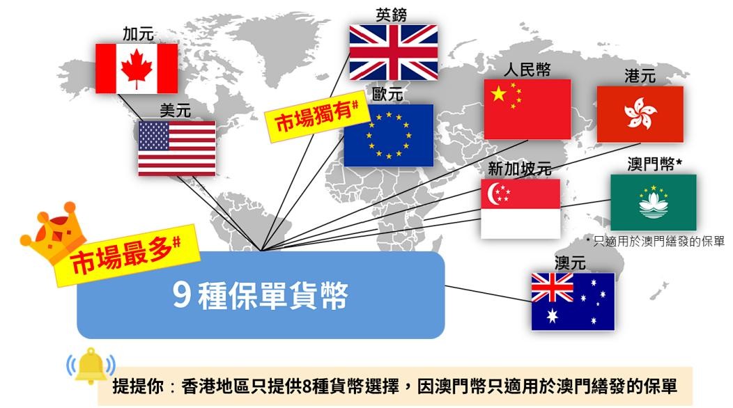 「挚汇」为您提供多样化的货币选择,共有9种货币供您自由选择。无论是人民币、美元、英镑、欧元、加拿大元、澳元、新加坡元、港元,还是澳门币(仅适用于澳门地区发行的保单),我们都能满足您的需求。在「挚汇」,您将感受到前所未有的便捷和丰富性!