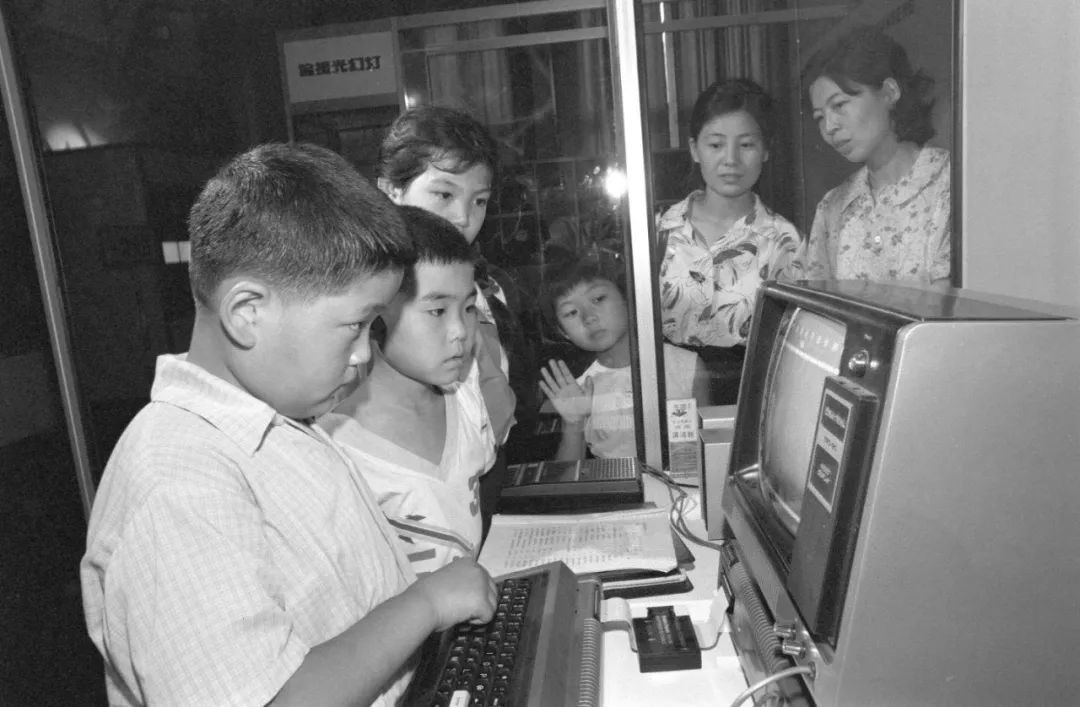 在位于北京的中国儿童少年活动中心,小朋友们在微型计算机前做有趣的游戏(1982年摄)。新华社记者 杨绍明 摄
