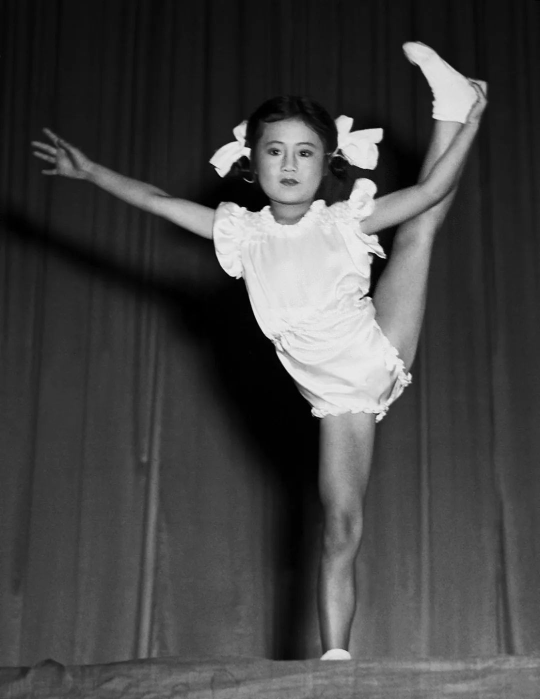 北京师范大学第一附属小学的毕静宜在首都举行的“六一”国际儿童节大会上表演自由操(1954年6月摄)。新华社记者 邹健东 摄