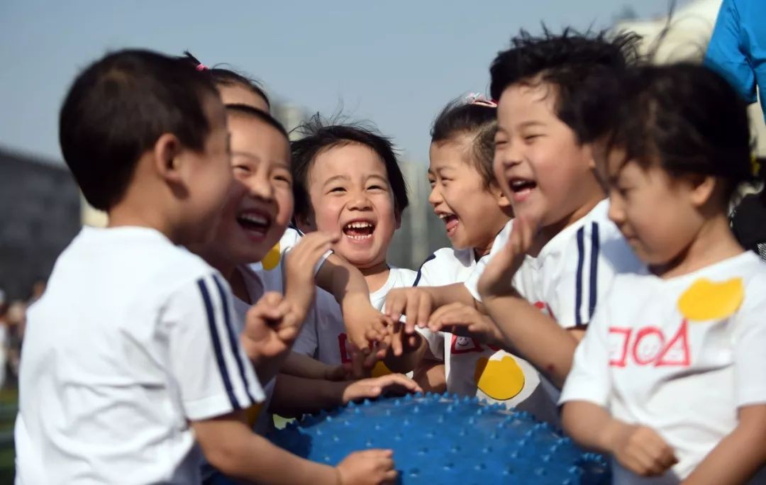 沈阳,幼儿园小朋友们参加趣味运动会推球游戏(2015年5月31日摄)。新华社记者 杨青 摄