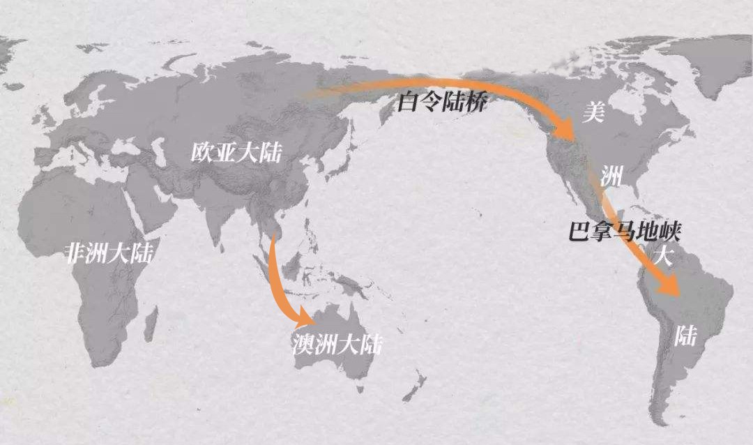 当时的智人们可以从东北亚穿过白令海峡(当时是白令陆桥)到达美洲,也可以从东南亚通过马来群岛到达澳洲。