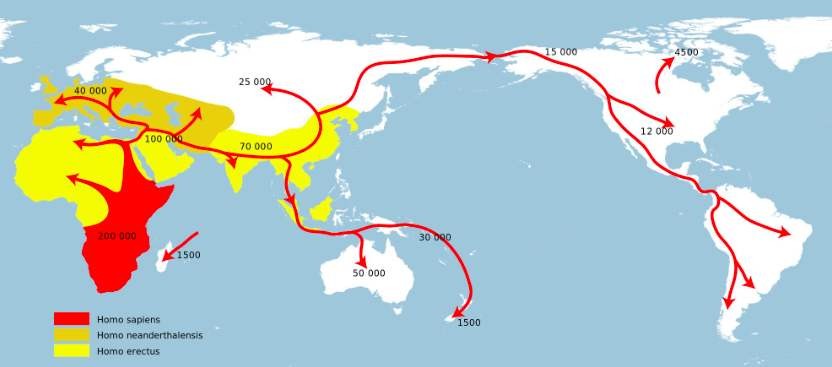 人类学研究表明:地球上的现代人,无论是黑人、白人、黄种人,都来自于同一祖先,就是14万年以前起源于非洲的“智人”。