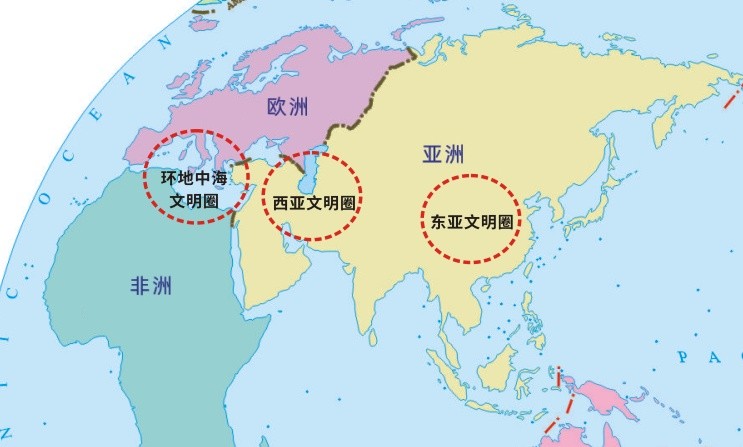 从历史沿革与现实意义出发,我们在“世界岛”勾勒出三大文明圈,分别是:以古希腊为代表“环地中海文明圈”、以两河流域为中心的“西亚文化圈”、以中国为代表的“东亚文化圈”。
