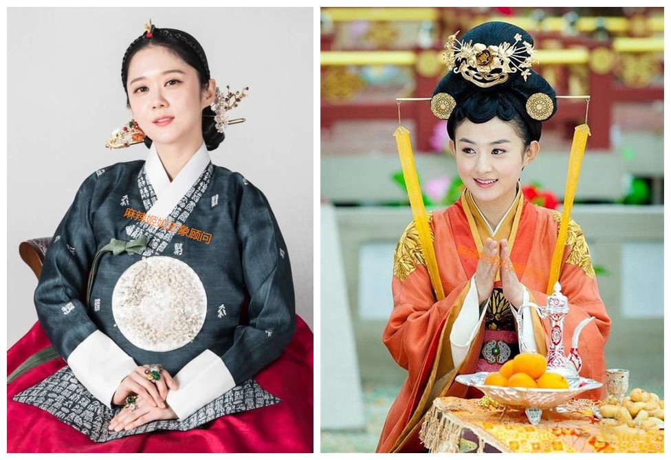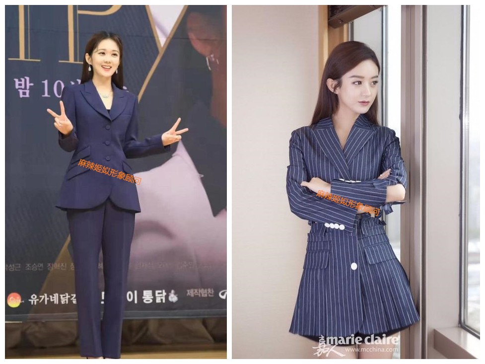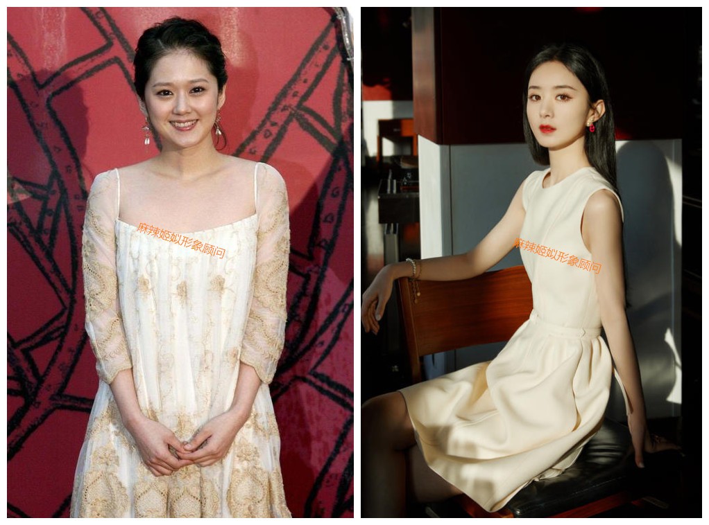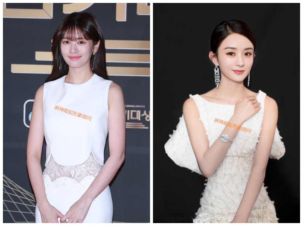 只看一张脸,只看发型与妆容,如果脸型挺相似,一般人不一定能一眼就看出来,这两张脸的差异,尤其是她们的妆容与发型,你看着还很相似的话,你肯定分不清楚她们之间的差异,看看这组穿搭,左图的赵丽颖与右图的张娜拉,你能看出来这两人的差异吗?赵丽颖明显要有距离,而张娜拉距离要近得多?会看的话,其实她们俩的服饰差距也挺大的。