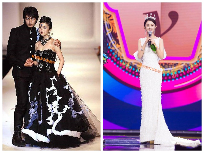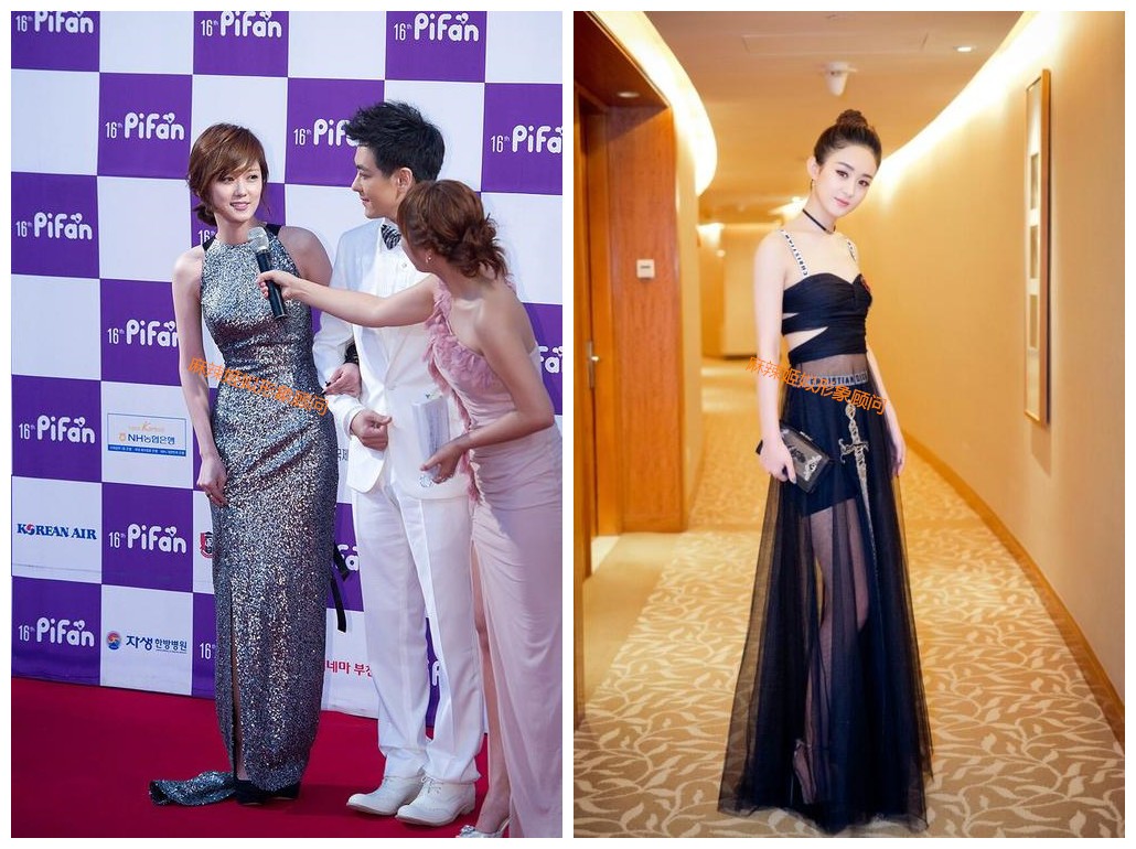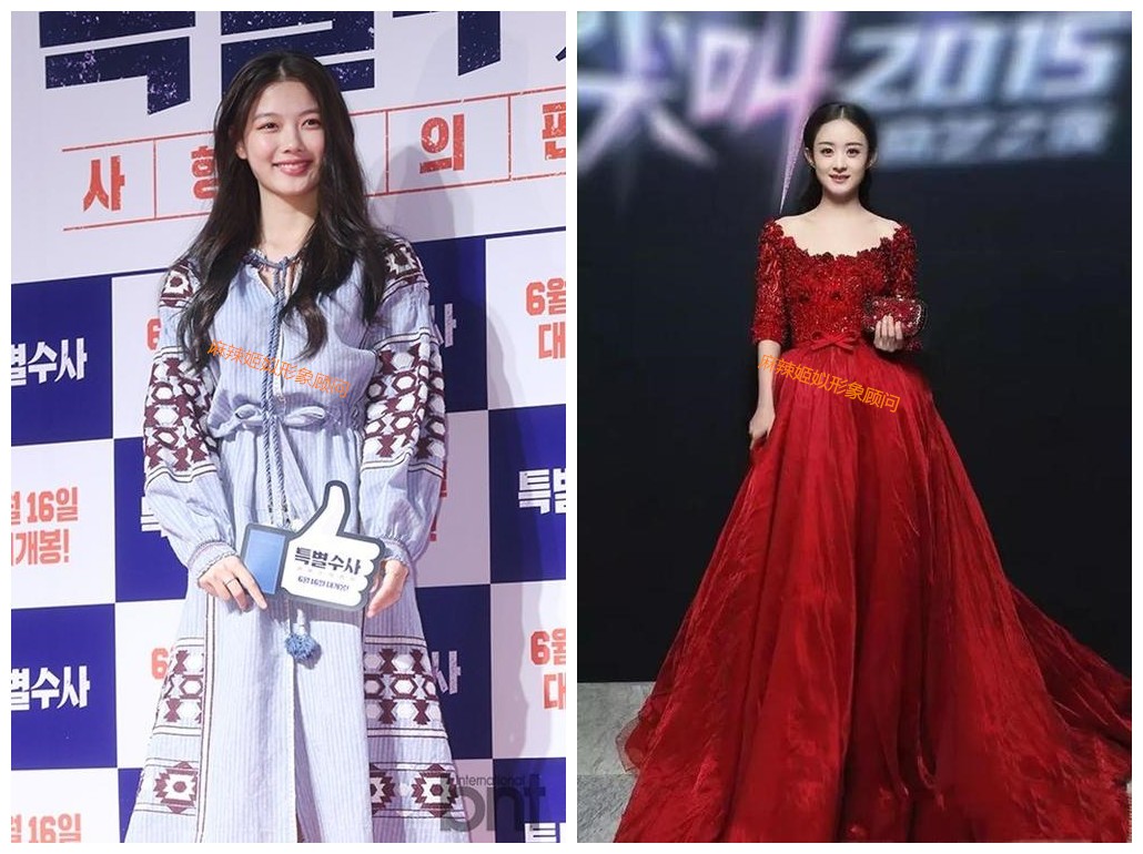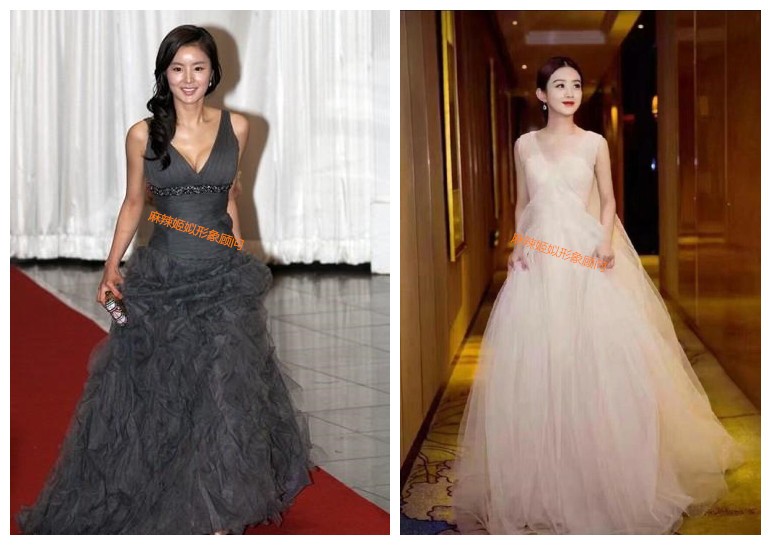 张娜拉的穿衣风格是很大气的,赵丽颖的穿衣风格可是远远没有她大气,看看下图这一组整体穿搭,左图穿礼服的张娜拉与右图同样穿礼服的赵丽颖,是不是两人的感觉差异很大?这两张脸,是挺像,可是呈现的感觉,因为穿衣风格与色彩特征组合,呈现的整体效果差距很大,所以即使脸型再像,脸上呈现的美感就是明显的不一样。