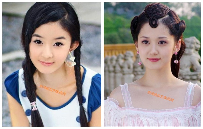 张娜拉与赵丽颖都扮演了很多古装剧,古装造型,也都是挺具美感的,看看下图这一组古装造型,左图从发型到妆面到服饰都挺适合的张娜拉,与右图从发型,妆面到服饰都挺适合的赵丽颖比,是不是很明显,张娜拉要大气得多,而赵丽颖要小巧,也要精致得多?同时很明显,张娜拉脸上的甜美是不是开始消失了,而赵丽颖脸上的甜美感,还是挺浓的?