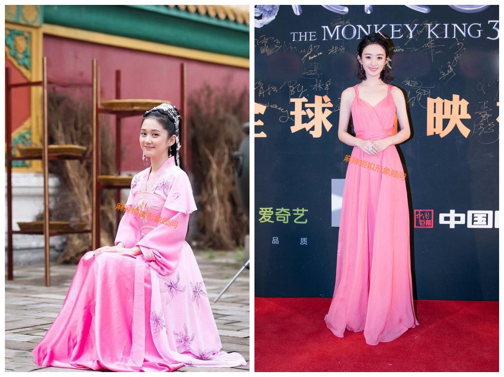 张娜拉的甜美感,随着年纪的增长会消失,尤其是不笑的时候,因为她的甜美只是色彩特征带来的一点点甜美,而赵丽颖随着年纪的增长,少女感是在消失,可是甜美感,不管笑与不笑,还是有那么一丝丝,因为赵丽颖的甜美主要是穿衣风格偏少女带过来的,当然,她的色彩特征也加强了这种甜美感,看看下图这一组整体穿搭,虽然都是粉色,但这两人是不是差距很大?完全不像?