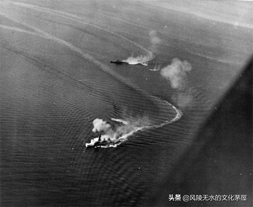 1944年10月24日“扶桑号”(图中下方)在经苏禄海北上时遭飞机轰炸受损(美军拍摄)