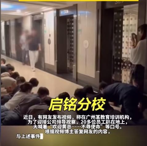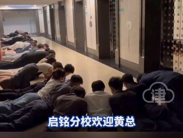 从画面中可以看到,几十个人整整齐齐地趴在地上,脸朝着电梯口的方向,他们异口同声地喊道:“启某分校,欢迎黄总!启某分校,生死不辱使命,用更好的结果,欢迎黄总的到来。”