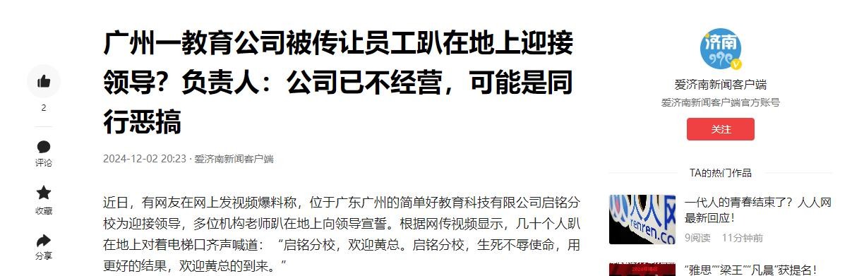 广州一教育公司被传让员工趴在地上迎接领导?负责人:公司已不经营,可能是同行恶搞——爱济南新闻客户端