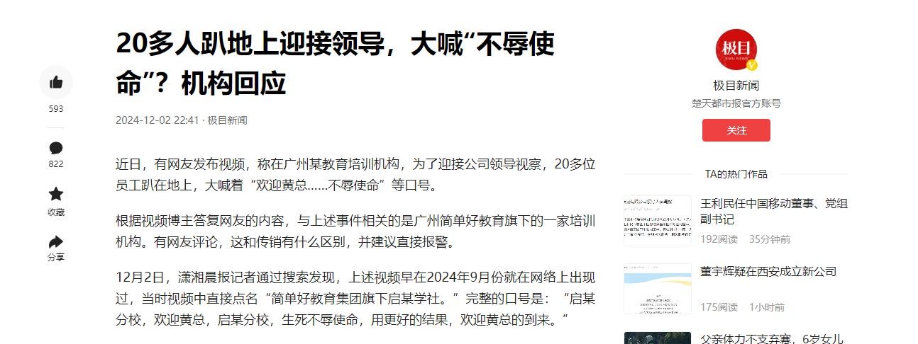 近日,一段视频在网上引起了广泛关注,视频显示,在广州某教育培训机构,20多位员工为了迎接公司领导的视察,做出了一个令人震惊的举动。