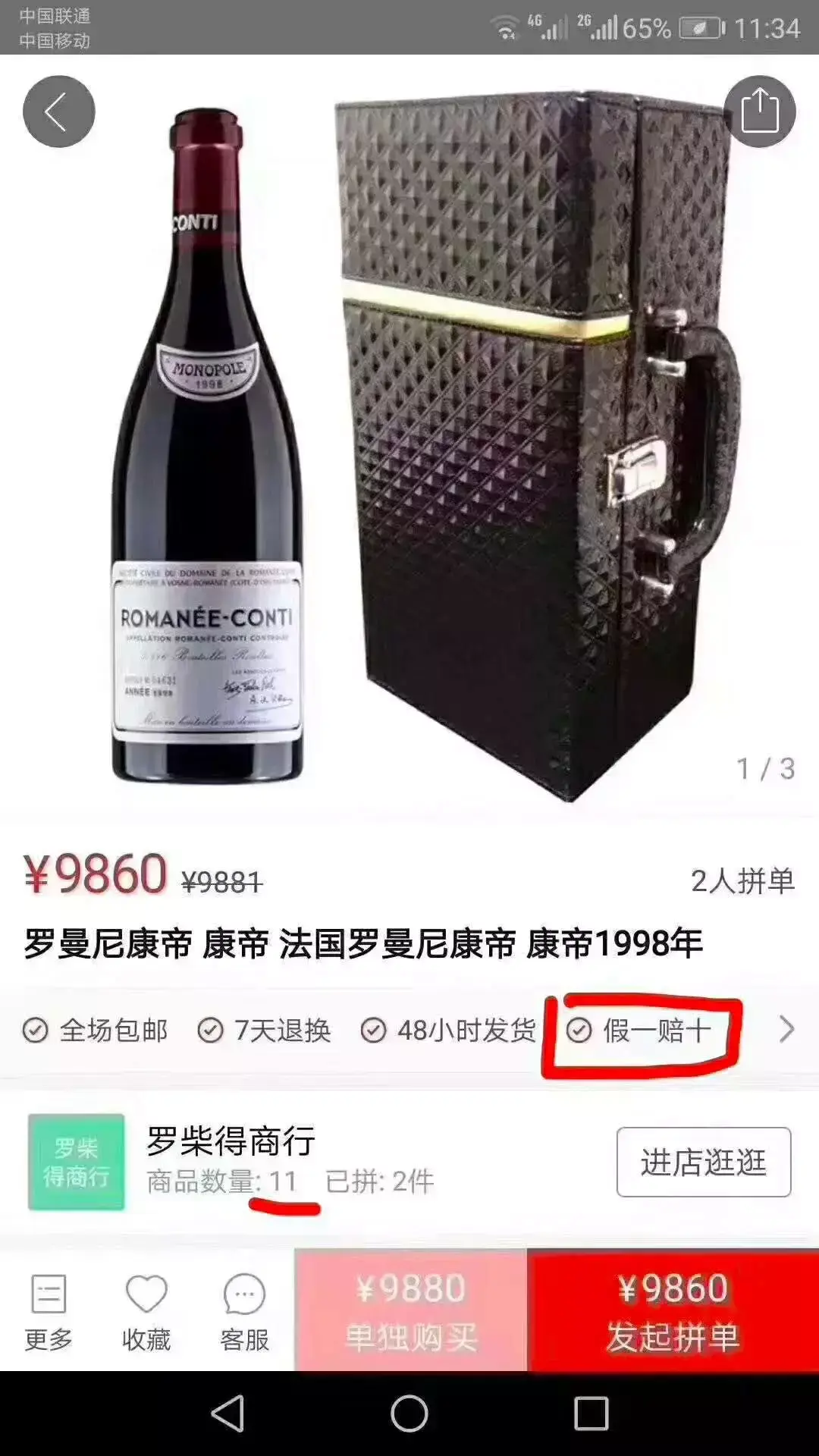 pdd平台商家售卖的1998年罗曼尼 康帝