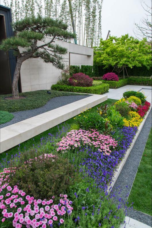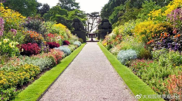 有些花境是比较突兀而孤立的,就需要考虑到花境在花园中的前后景色的协调。一个花境的前景能影响到花境的外观。草本植物构成的花境,在花境的的背后种植一样高的灌木绿篱,这样看起来更有层次感,极具戏剧的变化性效果。