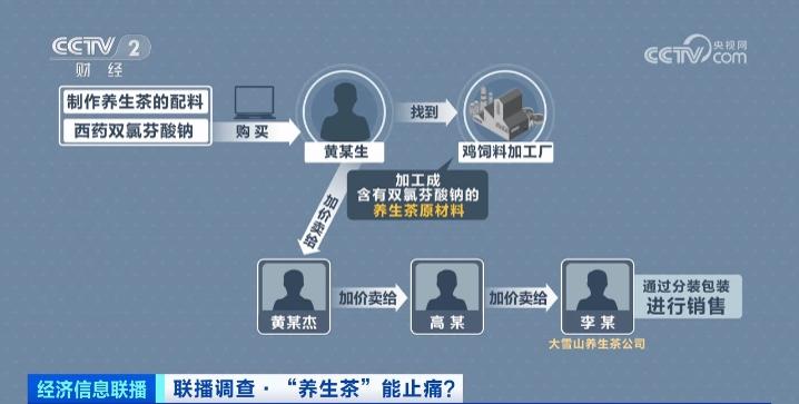 记者了解到,黄某生对中药材和化学药物有一定了解,在得知黄某杰可以将自己制作的含双氯芬酸钠的原材料卖出去后,两人形成合谋,开始非法生产所谓的 " 养生茶 "。