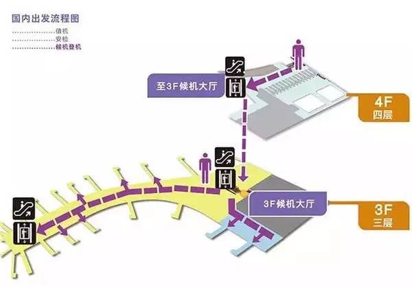 由5号门,6号门进入F值机岛区--安全检查--候机登机
