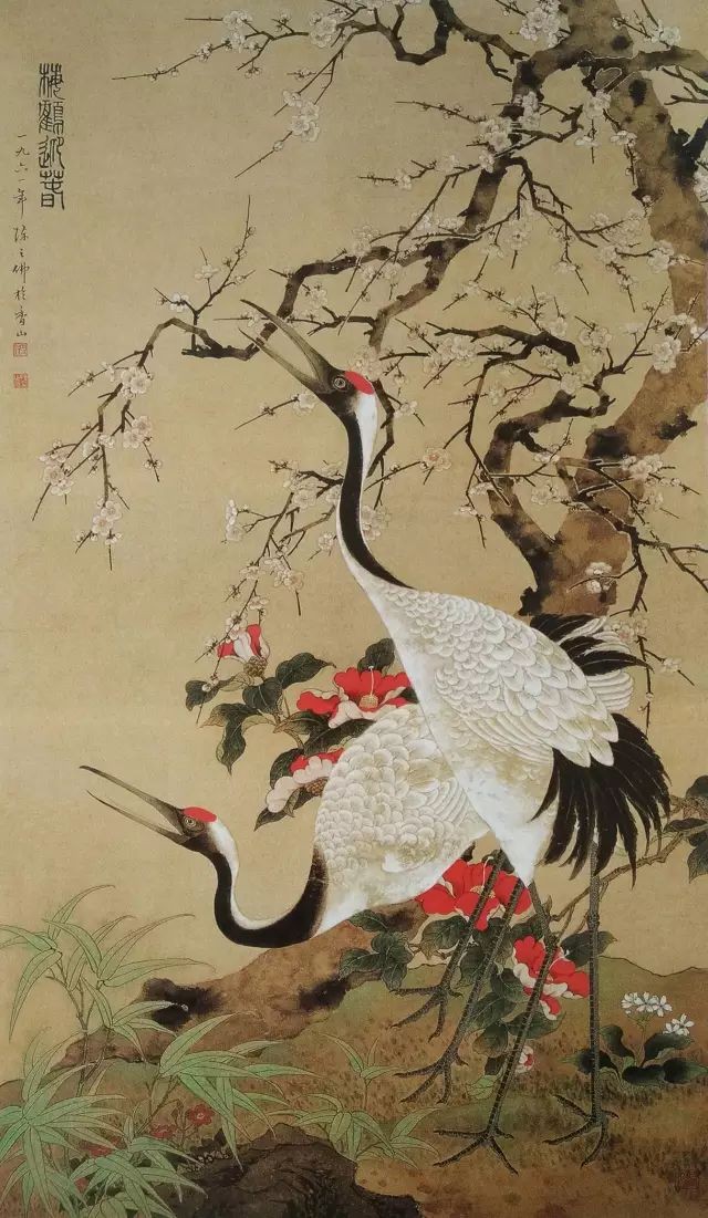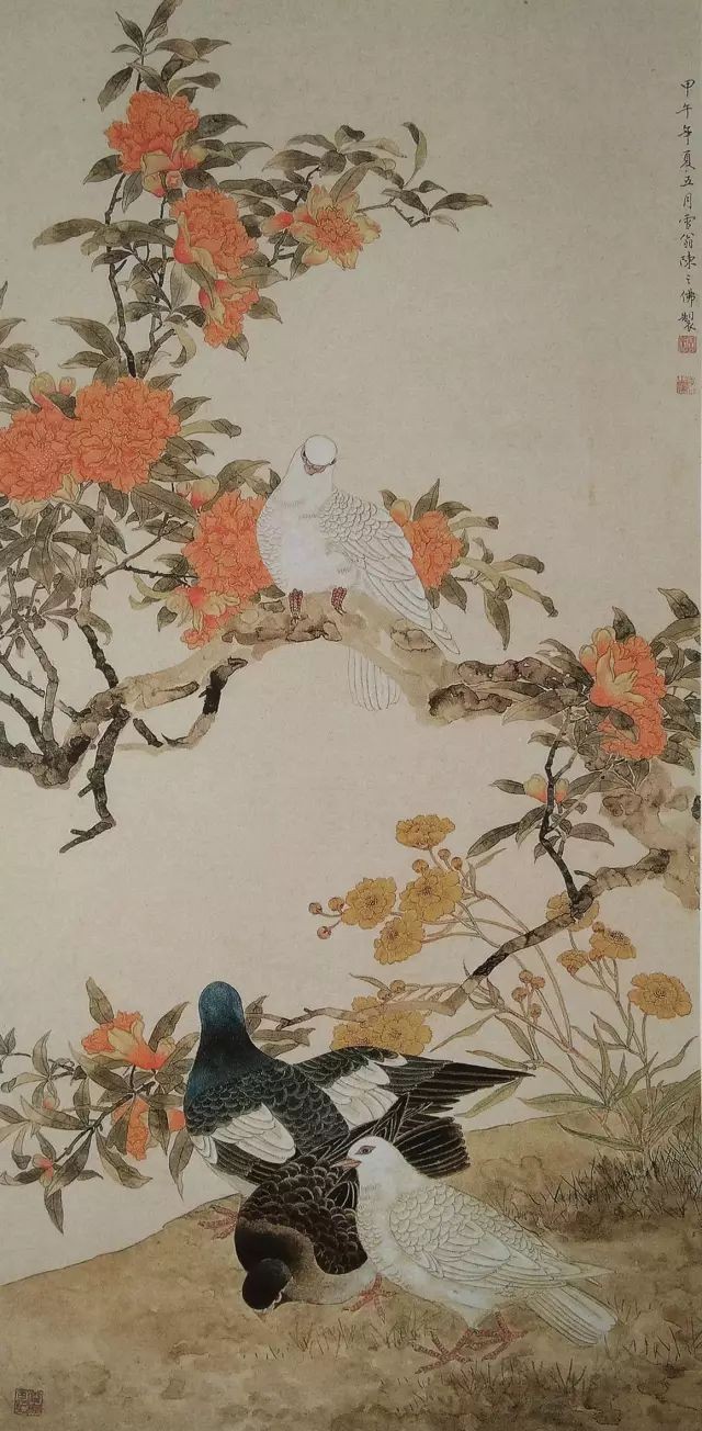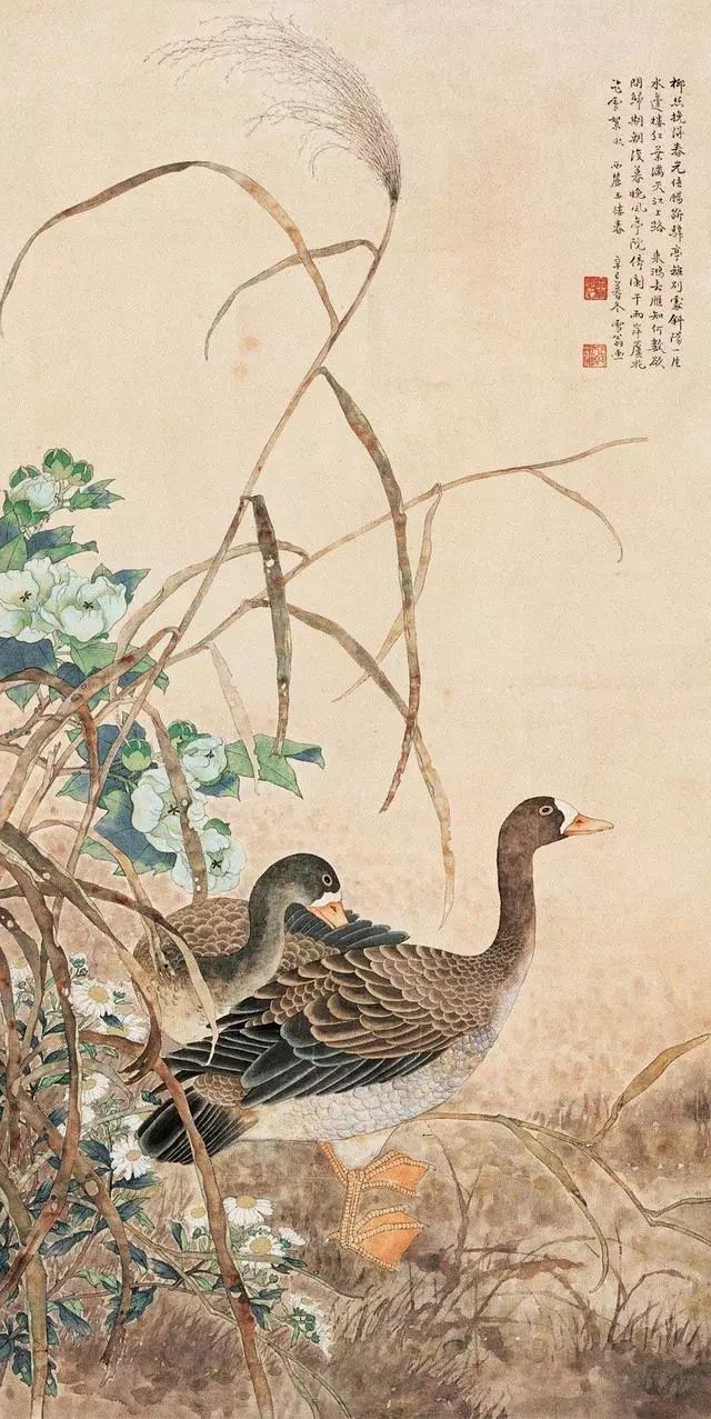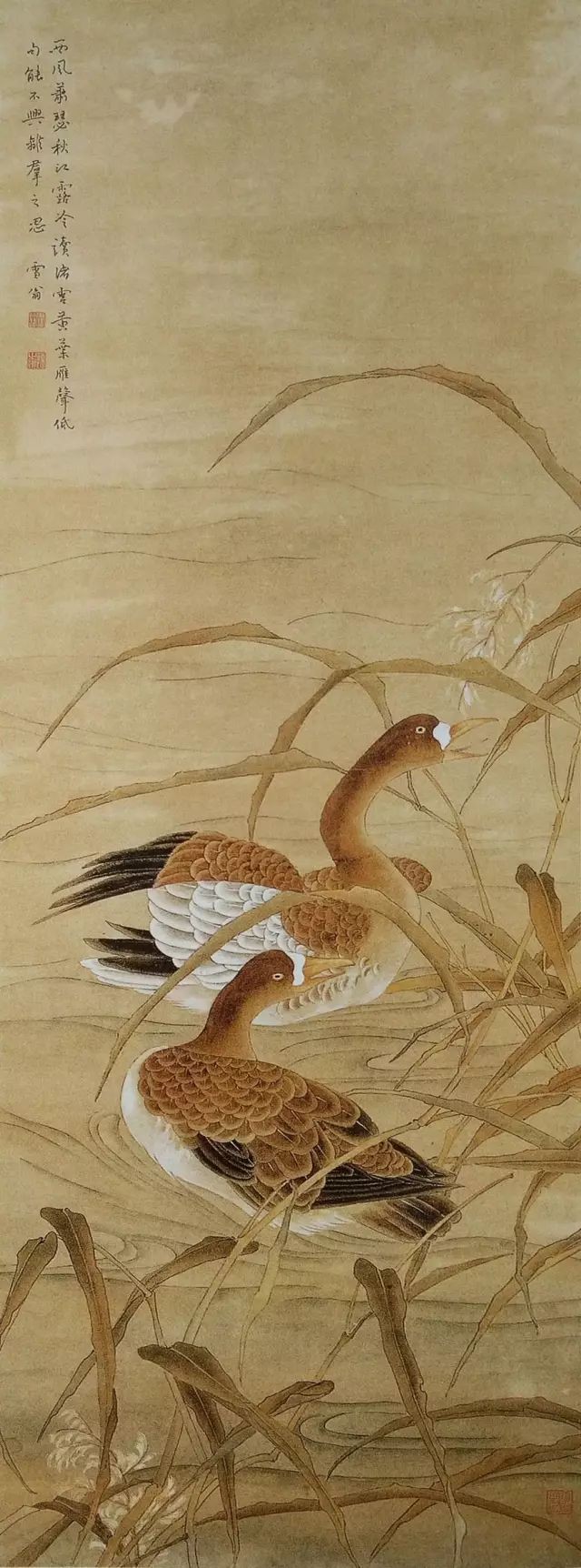 陈之佛笔下花鸟世界的艺术境界也源于其对自然与生命的人文关怀。他有多幅表现鸿雁的作品,陈之佛的工笔花鸟画中有多幅作品表现了双栖双息的不同鸟类,斑鸠、鸿雁、仙鹤、麻雀、鸳鸯、白鹭、鹌鹑、鸽子、燕子等,无论是传统观念中象征恩爱的鸳鸯,还是其它禽鸟,作者都赋予了它们一种美好的象征意义,生命因为相互依偎而更为动人。