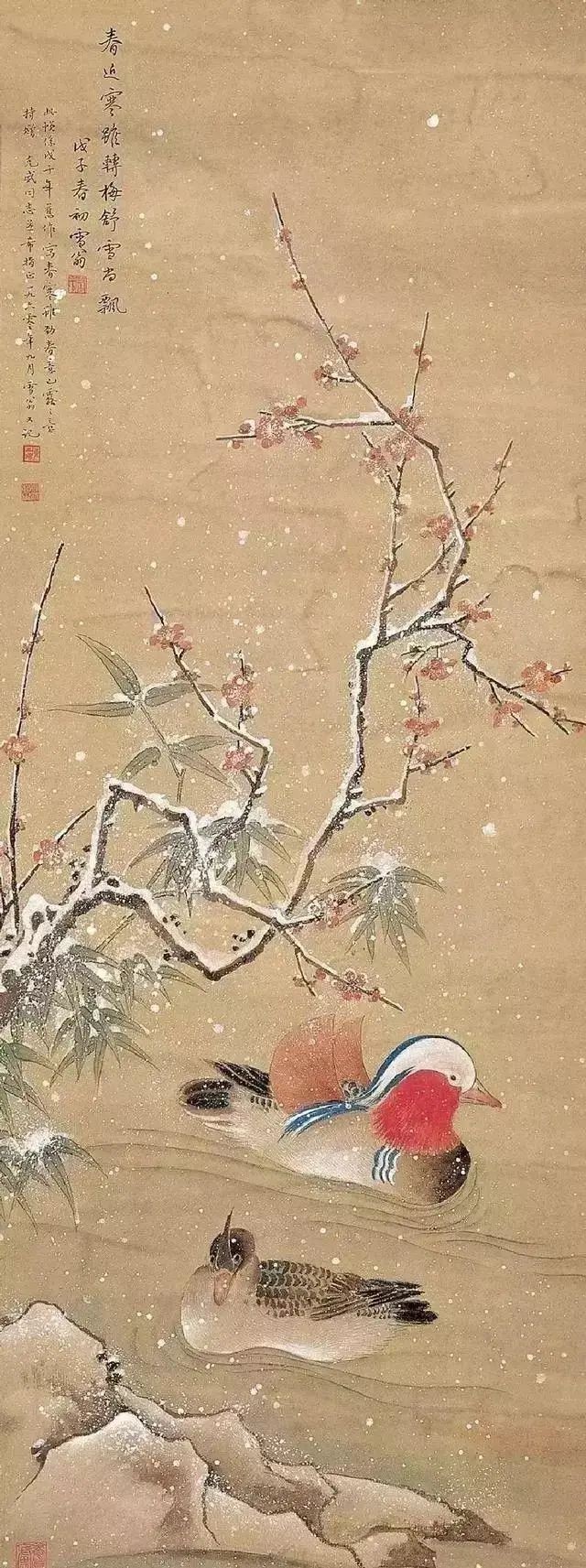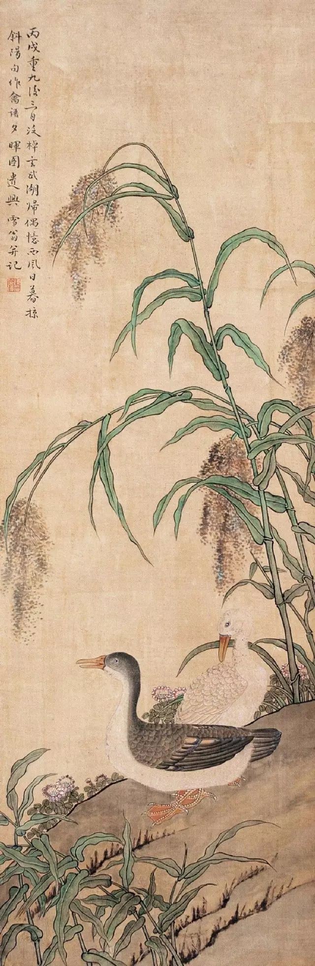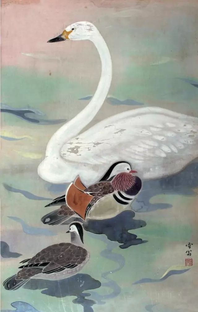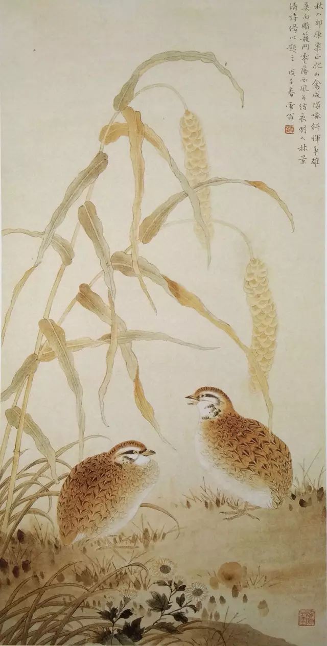 陈之佛笔下花鸟世界的艺术境界也源于其对自然与生命的人文关怀。他有多幅表现鸿雁的作品,陈之佛的工笔花鸟画中有多幅作品表现了双栖双息的不同鸟类,斑鸠、鸿雁、仙鹤、麻雀、鸳鸯、白鹭、鹌鹑、鸽子、燕子等,无论是传统观念中象征恩爱的鸳鸯,还是其它禽鸟,作者都赋予了它们一种美好的象征意义,生命因为相互依偎而更为动人。
