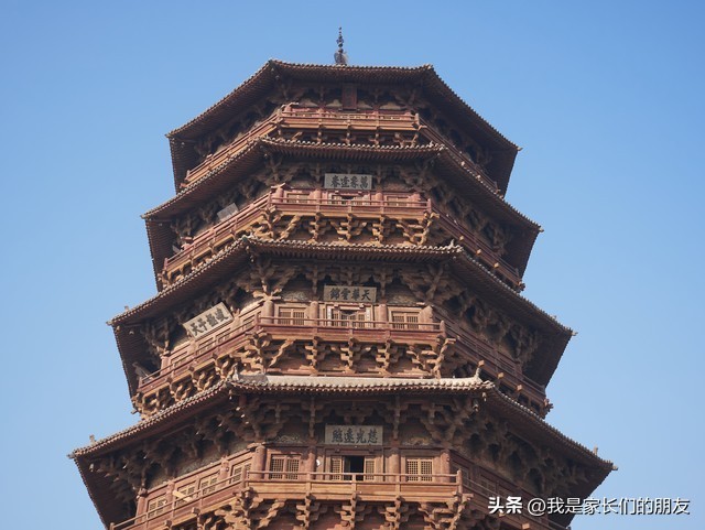 这座中国古建筑史上木塔的孤例,让我们看到了工匠使用木料的水平已经登峰造极。整座塔,除了塔基,第一层墙壁使用砖石,顶上的刹使用锻铁外,全部使用木材。