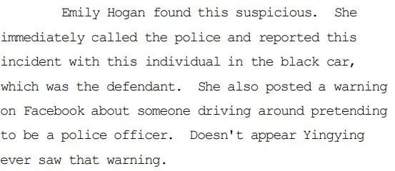 后来在审问中,他又承认他曾搭载过一名亚洲女性,但仅在几个街区后,当一个错误的转弯导致她惊慌失措时,他就把她放下了。