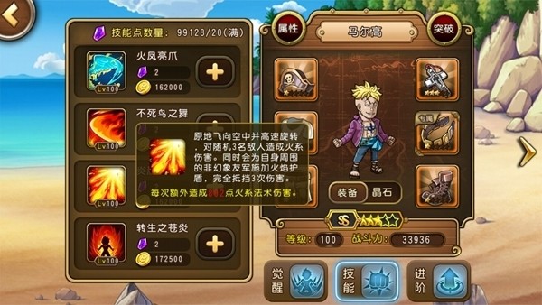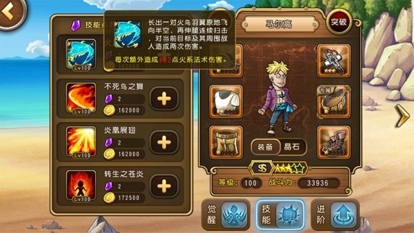 “火凤亮爪”是马尔高最常见的技能,和原著动画一样,当他施展的时候身体会长出一对火鸟羽翼原地飞向半空,再伸腿连续扫击,对当前目标及其周围敌人造成两次法术伤害,是不可或缺的小范围高伤技能。