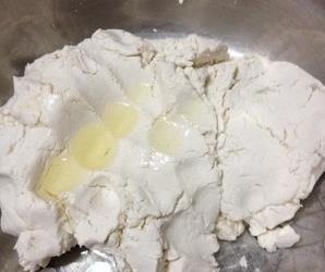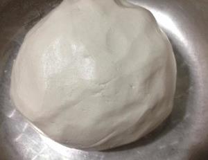 2.用340克温水和面,和到这种样子时,下两小匙色拉油再继续揉。