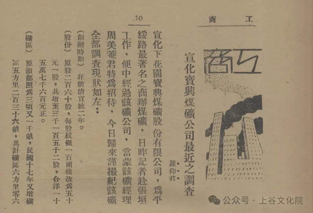 华北电灯股份有限公司也称张垣电灯公司。1915年5月21日,天津资本家李干忱向民国交通部立案,在张家口星隆庵东菜园创建华北电灯股份有限公司。1917年,他与天津卢木斋、苑祥甫等人合资35万银元,在张家口北菜园大马路25号建立发电厂,1918年,新装日本产120千伏安第一台机组开始发电,容量为98千瓦,主要用于城市照明,公司最初员工76人,到1925年员工已发展到千人左右。位于宣化庞家堡、烟筒山的察哈尔龙烟铁矿是张家口地区最早的近现代钢铁企业。该矿成立于1919年3月,采取官商合股形式,其中官股5000股,折合银元250万元,商股4591股,折合银元229.55万元,日炼铁300吨。同年,龙烟公司花费5 .8万多银元,在石景山东麓征购土地1300亩,成立龙烟铁矿股份公司石景山炼厂,这就是今天首都钢铁公司的前身。宣化还有许多国企公司和部属机械制造业工厂就不在此一一列举了。
