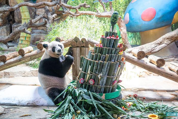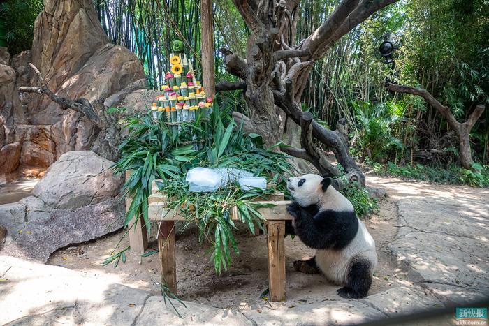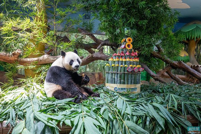 新快报讯 记者陈镟/文 夏世焱 实习生 邱帆/摄影报道 7月29日,目前全球唯一大熊猫三胞胎——“萌萌”“帅帅”和“酷酷”迎来八周岁生日。长隆野生动物世界工作人员为它们精心准备了食材丰富、营养均衡的“竹子蛋糕”。来自五湖四海的熊猫迷,和身着汉服为这三只国宝庆生的亲子家庭数百人,共同参与了“萌帅酷”的生日盛宴。广州长隆野生动物世界的“大熊猫主题月”也随之开启,期间将为游客带来丰富多彩且寓教于乐的活动。