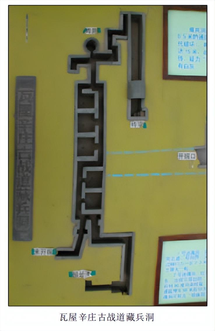 “藏兵洞”位于瓦屋辛庄村古地道群中心位置。它虽然不像‘迷魂洞”那样扑朔迷离,但也经常变换方向。此洞距地表1.7米左右,有3层向西的台阶,下台阶后向北拐,进入—个南北走向的通道。通道中有5间并排的小屋,每间屋大约2平方米左右,可以藏人。通道和小屋都铺有地砖。每间小屋均分为两组,中间有一通道相隔,两组小屋与通道相接的开口方向相反,即使点烛相照,也不能一览无余,隐蔽性很强。更使人惊异的是,“藏兵洞”的一个出口竟然是在一口水井里面。