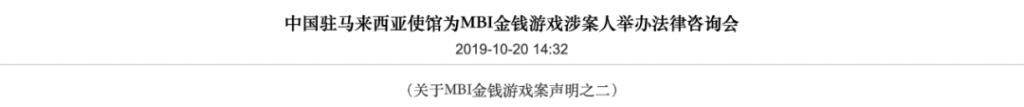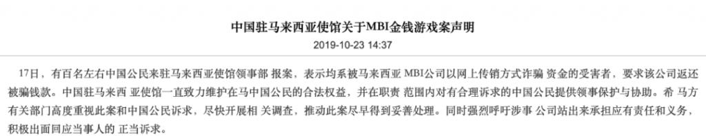 就在半个多月前的 10 月 17 日,百名中国公民来到中国驻马来西亚使馆领事部报案,表示马来西亚的 "MBI" 集团搞传销,骗走了他们的巨额钱款,要求大使馆介入。