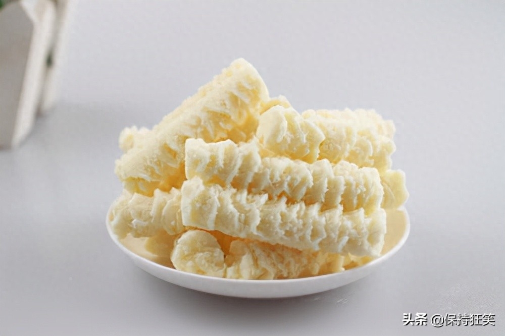 奶酪,又名干酪,是一种发酵的牛奶制品,是将分离出酥油的酸奶,经微火煮熬后装入布袋,挤出酸水,成碎块状晾干即为奶酪,质硬而酸甜,被誉为乳品中的“黄金”,是蒙古族民众喜爱的奶食品之一。在内蒙古大多都在行囊中放几块奶酪,以防不测,备以充饥解渴,也是内蒙古著名的特产零食。