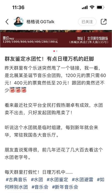 独立乐评人 " 格格说 GGTalk" 在小红书上提到:" 水团卖不出去,只好发起团购甩卖了!北展某圣诞节音乐会团购,1200 元的票只需 60 元,400 元的票竟然低至 20 元!" 这显然是音乐行业从业者、资深乐迷共同教育了市场的成果。