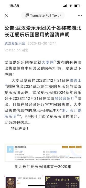 大麦网发布的 2025 年 12 月 31 日在珞珈山剧院演出 2024 武汉新年交响音乐会与武汉爱乐乐团无关,武汉爱乐乐团 2024 新年音乐会于 2025 年 12 月 31 日在武汉琴台音乐厅演出,且仅在琴台音乐厅官方网站售票。大麦网售票信息中的演出乐团标注为 " 湖北长江爱乐乐团 ",但使用了武汉爱乐乐团的简介,此为虚假信息。