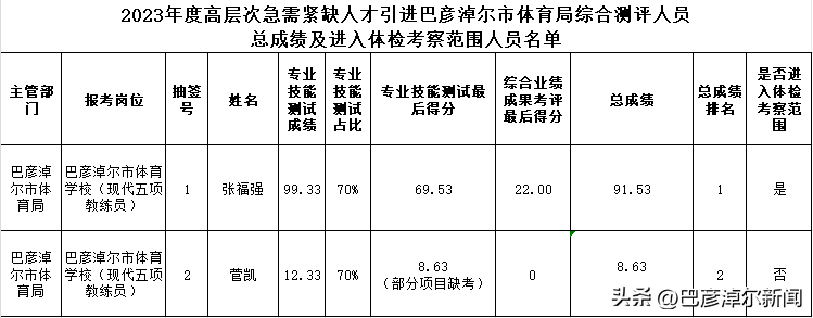 关于2025年度高层次急需紧缺人才引进巴彦淖尔市体育局综合测评人员总成绩及进入体检考察范围人员名单的公告