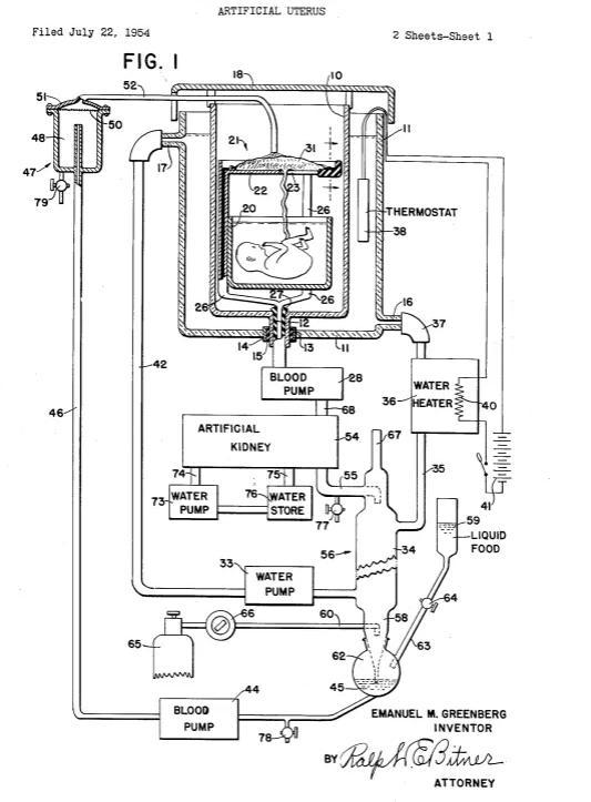1954 年,伊曼纽尔 · 格林伯格首次设计了人造子宫的装置并申请了专利。设计包括一个用来放置充满羊水的胎儿的水箱、一个连接到脐带的机器、血泵、一个人造肾脏和一个热水器。不过,这仅仅是一个粗糙的设想。