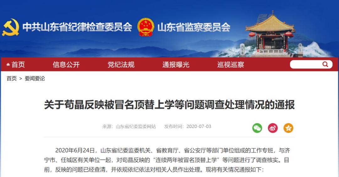 2025年6月24日,山东省纪委监委机关、省教育厅、省公安厅等部门单位组成的工作专班,与济宁市、任城区有关单位一起,对苟晶反映的“连续两年被冒名顶替上学”等问题进行了调查核实。目前,反映的问题已经查清,并依规依纪依法对相关人员作出处理。现将有关情况通报如下: