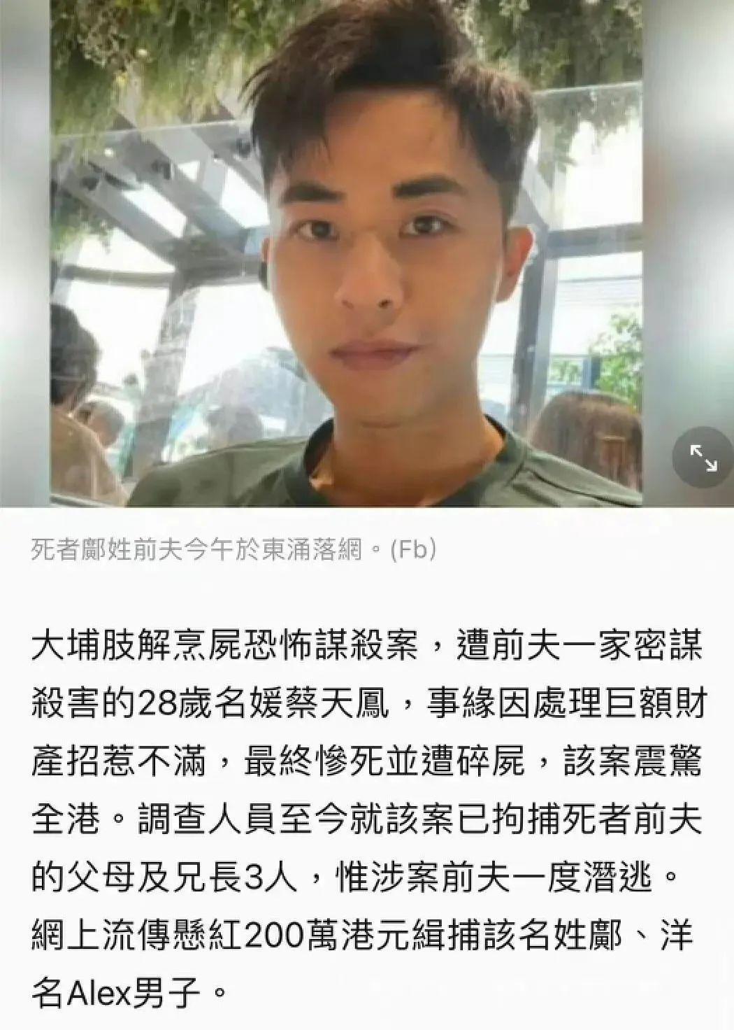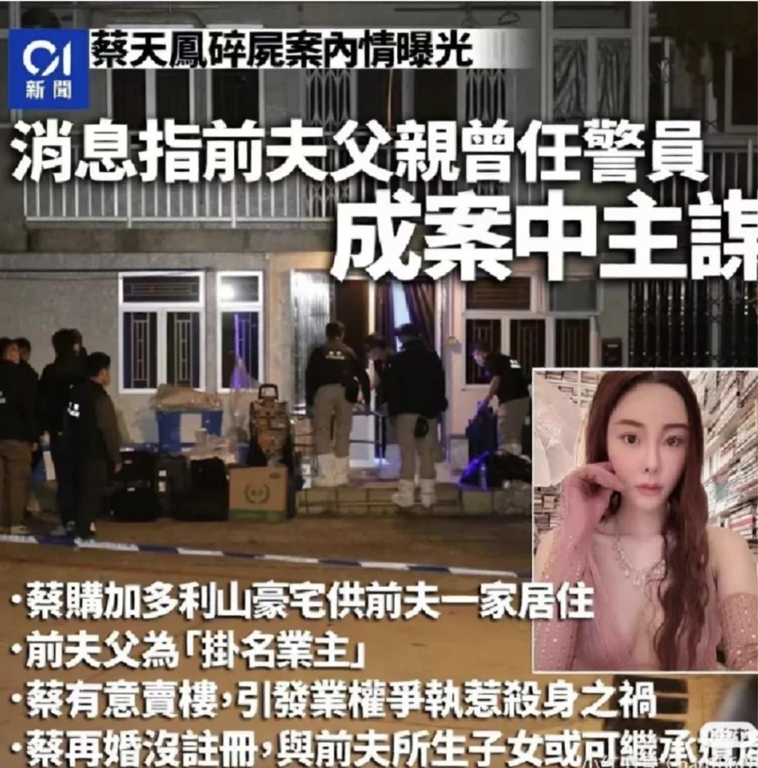 24日,香港大埔龙尾村发现一宗碎尸案,死者被残忍地分尸烹煮,经警方调查,死者为刚参加完时装周回港的28岁女模特、名媛、谭仔米线创始人儿媳——蔡天凤。