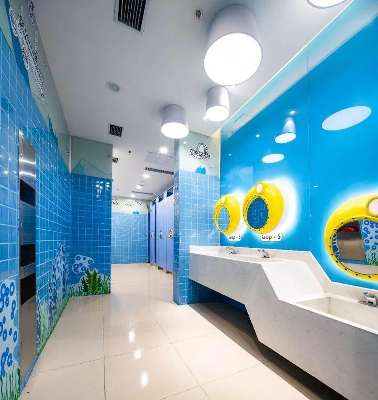 这里有超级卡通的儿童洗手间,洗手池、座位都专为宝宝设计,风格活泼,色彩鲜明,迎合儿童心理。