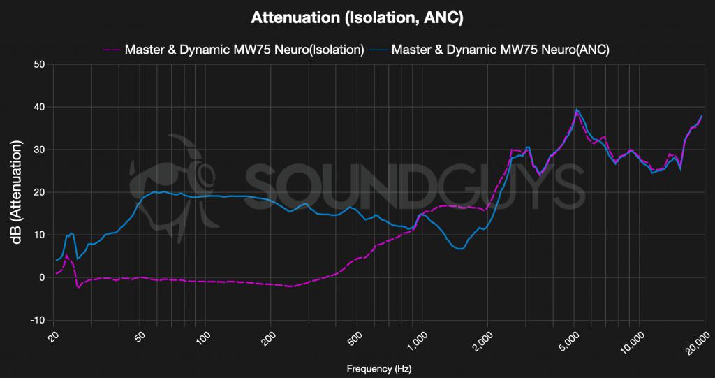 耳机还具备 主动降噪(ANC)功能,SOUNDGUYS 网站进行了非常详细的测评,数据显示 MW75 Neuro 能够将外部噪音的感知响度平均降低 74%,虽然使用了织物海绵耳垫作为脑电图传感器,仍然有不错的降噪效果。