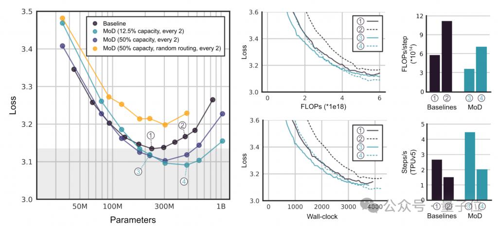 存在一些 MoD 变体,在步骤速度上比 isoFLOP 最优基线模型更快,同时实现更低的损失。这表明在训练之外,MoD 的计算节省仍然有效。