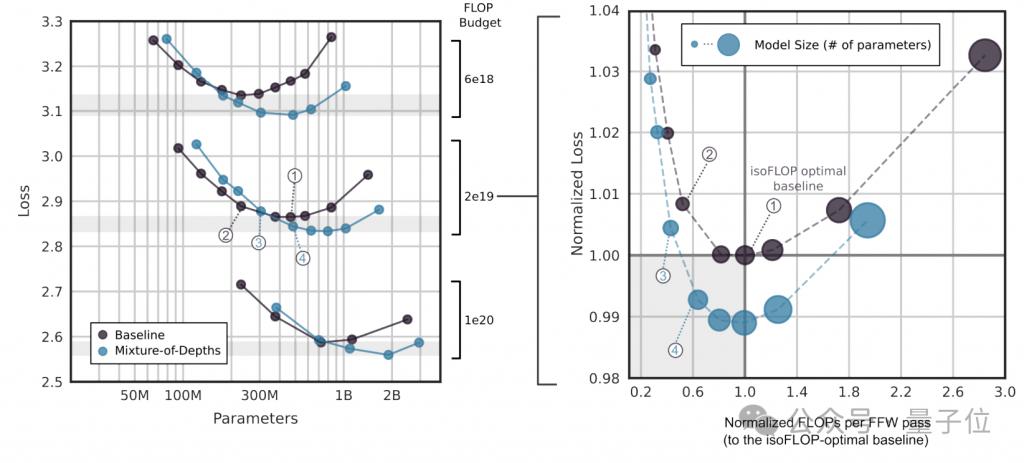 结果显示,在更多 FLOP 预算下,FLOP 最优的 MoD 仍然比基线模型有更多的参数。