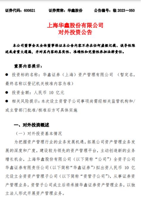 财联社 11 月 26 日讯(记者高艳云)券商资管子有望再添一员。11 月 26 日,华鑫股份发布公告,公司全资子公司华鑫证券拟出资 10 亿元设立全资资管子公司,从事证券资产管理业务,资管子公司成立后将承接华鑫证券资产管理业务,以独立法人形式开展资产管理业务。