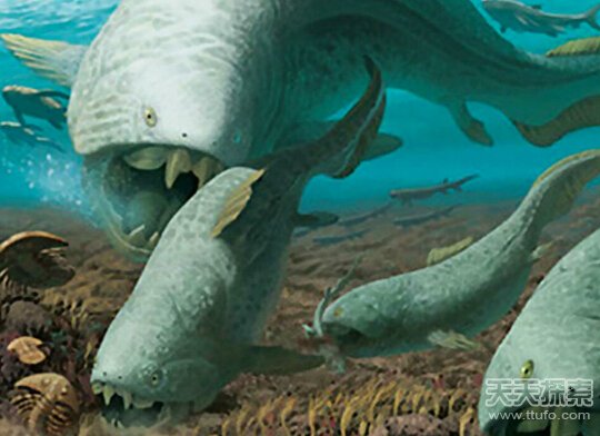 邓氏鱼是史前一种可怕的鱼类,它的牙齿犹如锋利的匕首,体长大约30英尺。