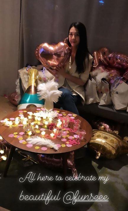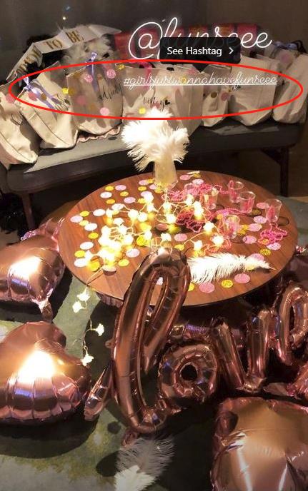 值得注意的是,杨永晴身后的沙发上似乎摆放着闺蜜们的礼物,袋子上系着紫色的蝴蝶结。有媒体猜测,这些可能是给杨永晴的婚前礼。真的很贴心呢!