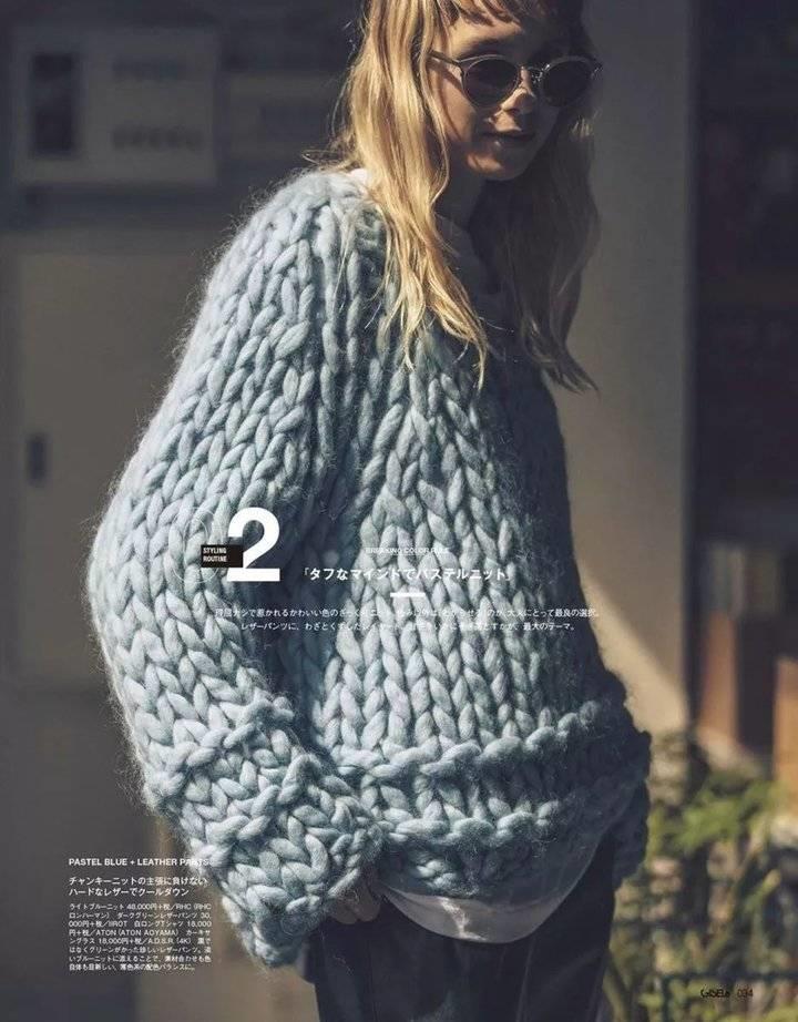 粗棒针毛衣时装感很强,但是对于大骨架的人来说却并不是最好的选择。尤其是套头粗棒针毛衣,大骨架更要避开。